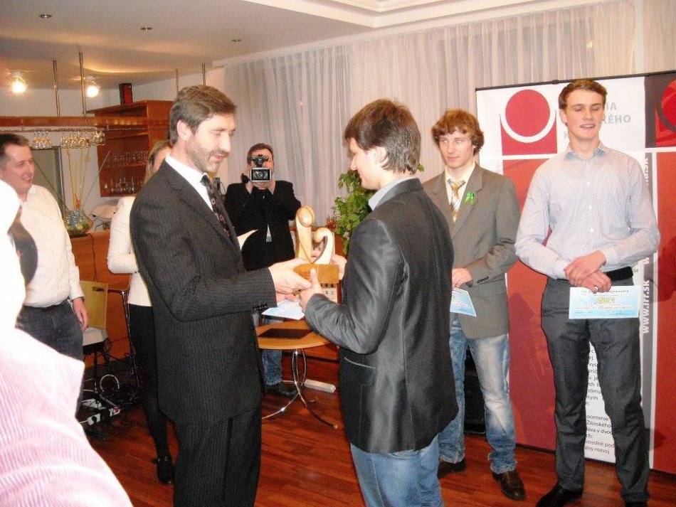 Dominik si preberá ocenenie z rúk krajského župana Juraja Blanára