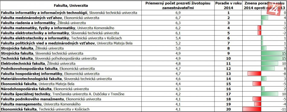 Spomedzi fakúlt rebríček záujmu zamestnávateľov už niekoľko rokov po sebe vedie Fakulta informatiky a informačných technológií bratislavskej Slovenskej technickej univerzity. Zdroj tabuľky: profesia.sk